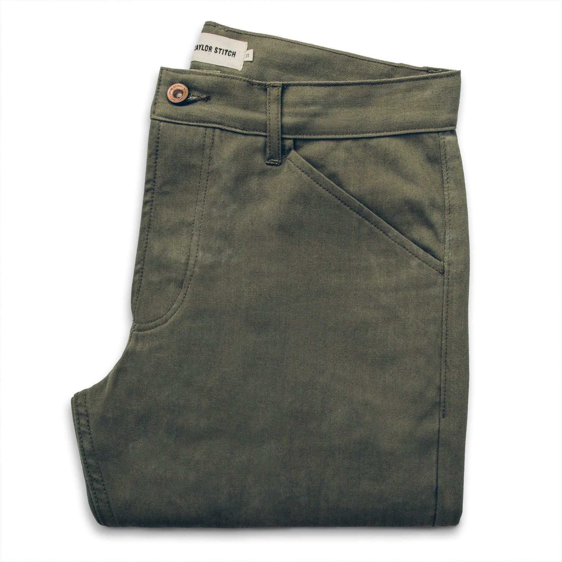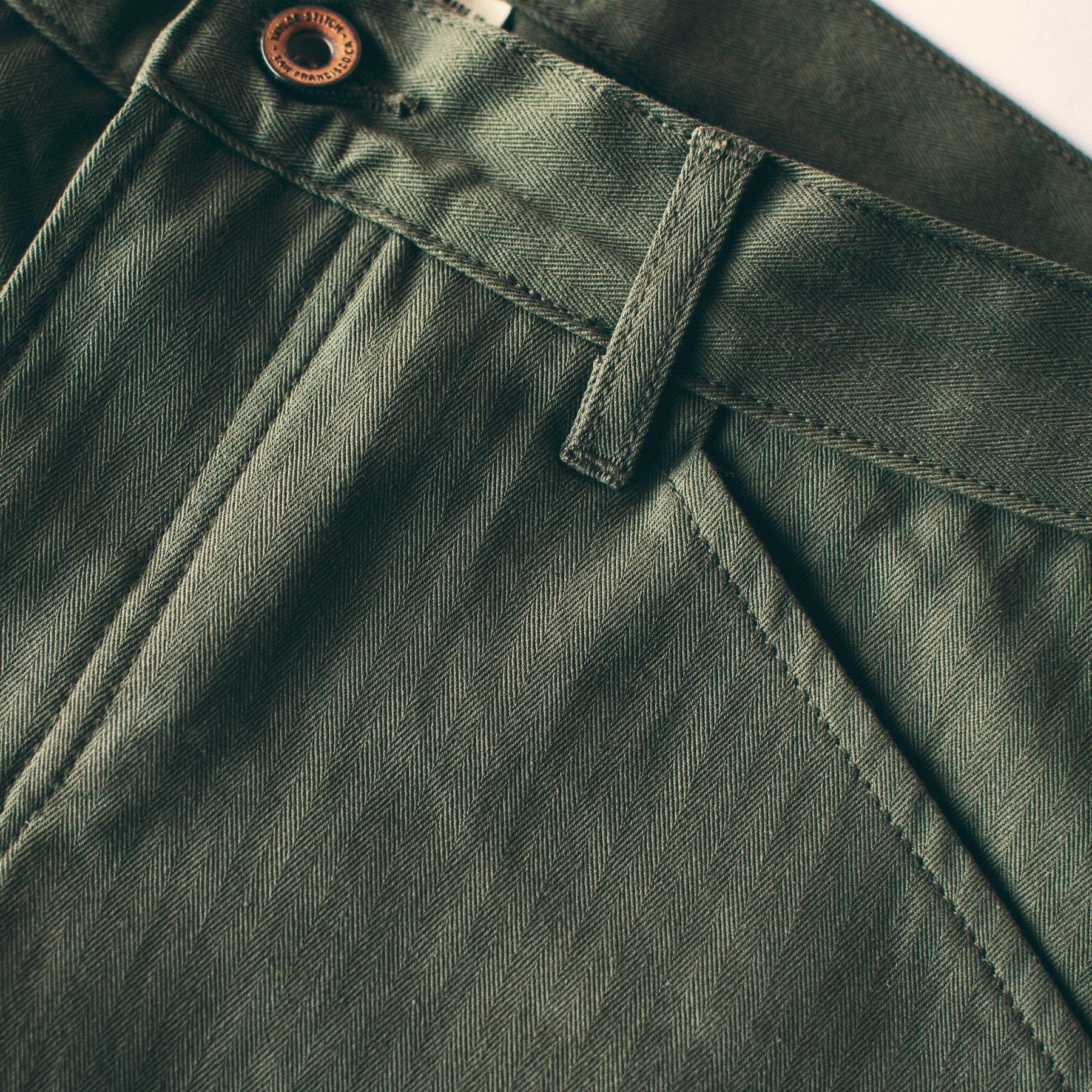 The Camp Pant is our lightweight utility pant with a smart, tailored fit. Constructed from an olive drab herringbone. Limited in quantity.