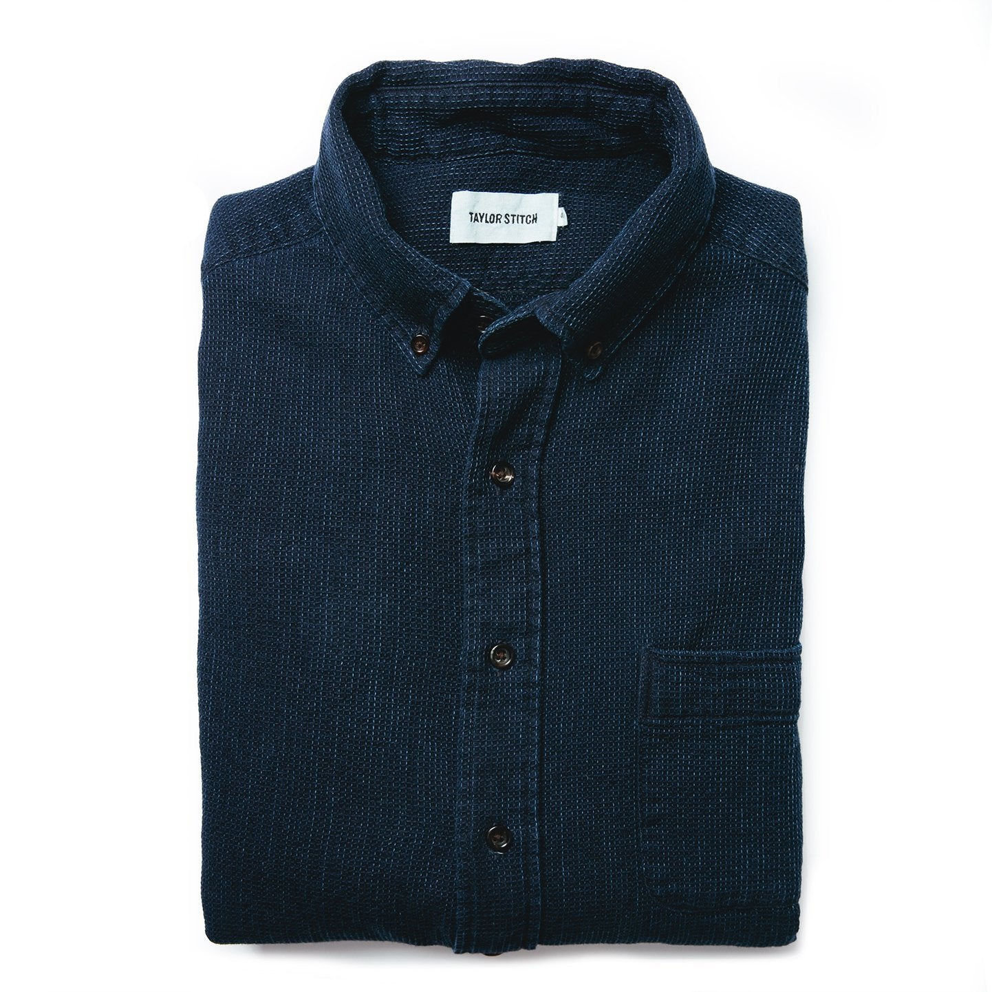 Our staple shirt has a tailored fit with a triple button collar. 7 years in the making, our oxford comes in an limited Indigo waffle fabric. In Stock now.